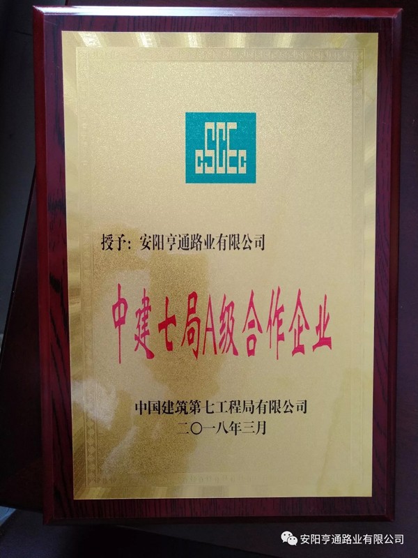 在2018年3月8日中建七局交通公司“2018年度生產推進會暨2017年度供應商大會”上,安陽亨通路業(yè)有限公司又獲得了中建七局交通公司頒發(fā)的“優(yōu) 秀合作企業(yè)”的榮譽稱號。